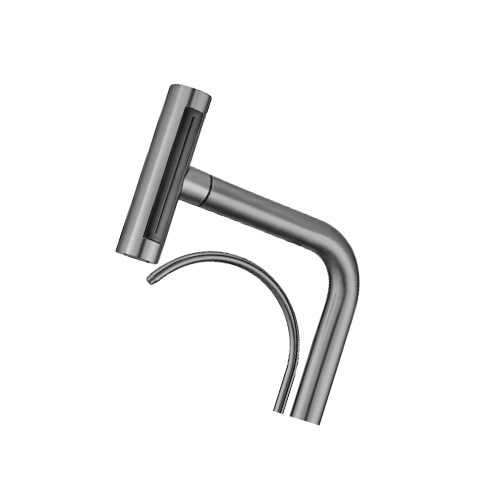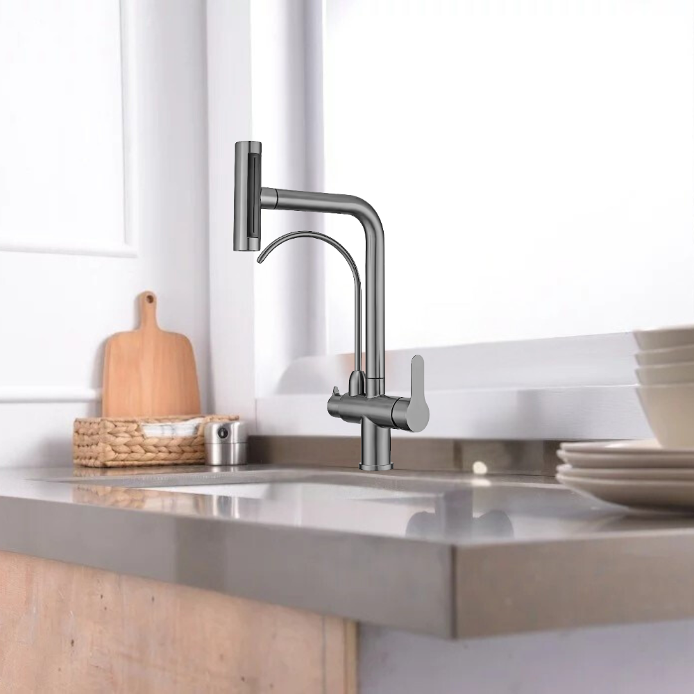 Bateria este prevăzută cu doi robineti, fiecare funcționând separat si o para de dus extractibila. În pachetul bateriei cu 3 căi veți primi și cele 3 racorduri de alimentare. Un racord este folosit pentru apa filtrată. Acesta are în capăt un conector rapid de 1/4″ care vă permite legarea directă la furtunul flexibil de 6 mm al filtrului de apă. Celelalte 2 racorduri flexibile sunt standard și au filetul de 1/2″.