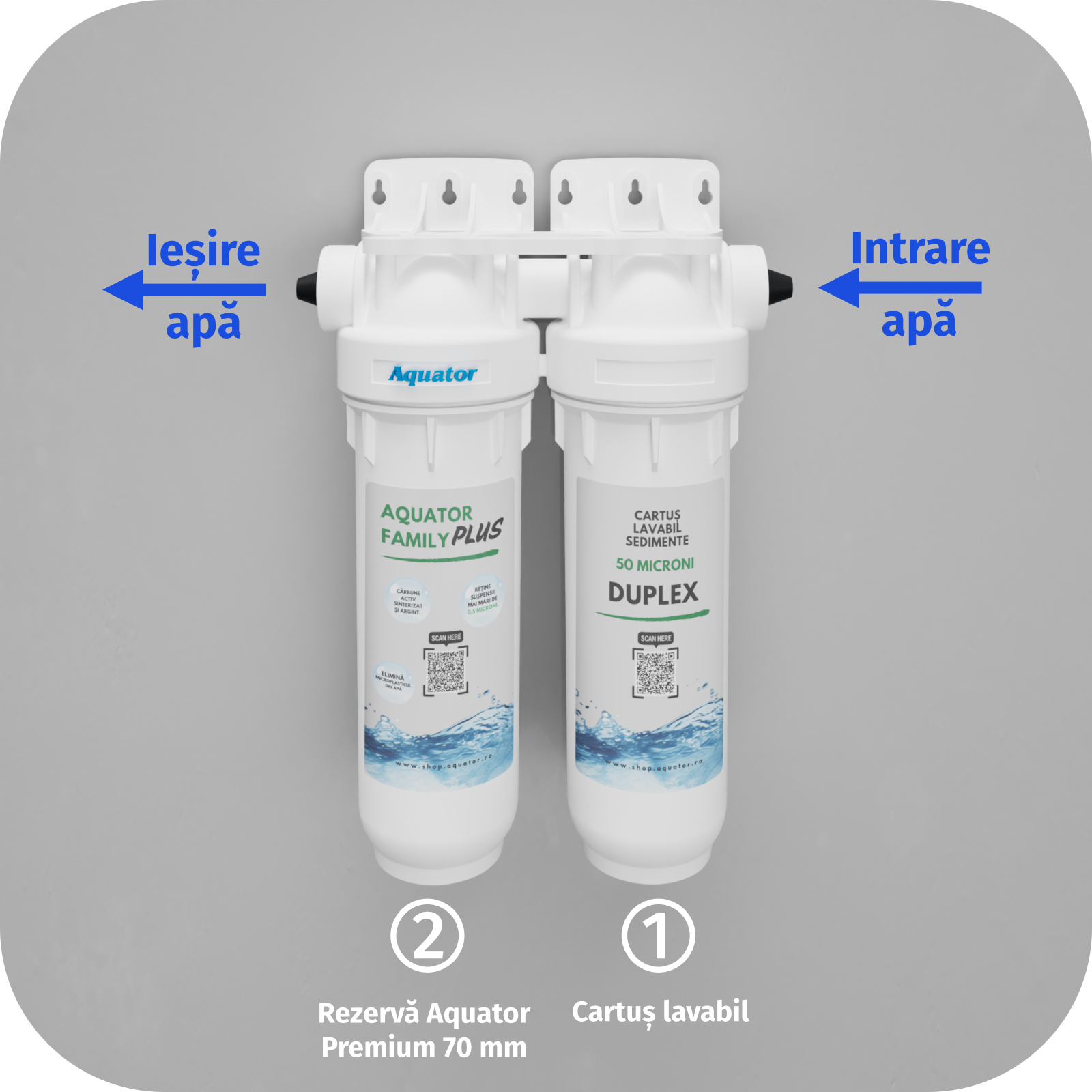 Filtru de apa, Aquator Family Duplex Plus este destinat filtrării apei din rețeaua publică de distribuție a apei. Cartușele filtrante se află in interiorul filtrului. Acest filtru este compatibil cu: