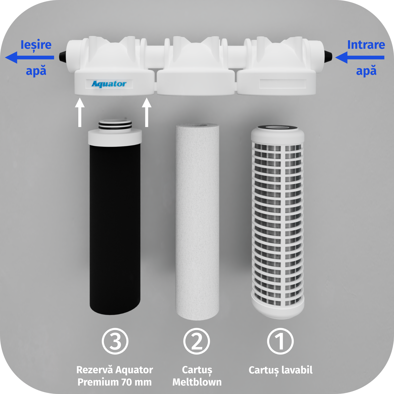 Filtru de apa, Aquator Family Triplex Plus este destinat filtrării apei din rețeaua publică de distribuție a apei. Cartușele filtrante se află in interiorul filtrului. Acest filtru este compatibil cu :