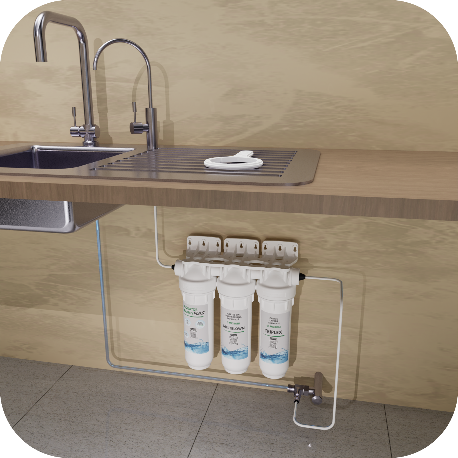 Carcasa filtrului Family Triplex Plus se montează sub chiuvetă. Se intercalează conectorul tip T pe traseul de apă rece de la chiuvetă. Bateria filtrului se montează pe blat astfel încât apa care trece prin filtru, apa filtrată, are robinetul separat de bateria de la chiuvetă, care are apă nefiltrată. El este format din trei carcase, una conține o sită lavabilă care filtrează mecanic la 50 microni, urmatoarea un cartus polipropilena care filtreaza la 5 microni și o carcasă care conține rezerva din cărbune. Sita si cartusul din polipropilena prelungesc durata de viață și capacitatea de filtrare mecanică a cărbunelui.
