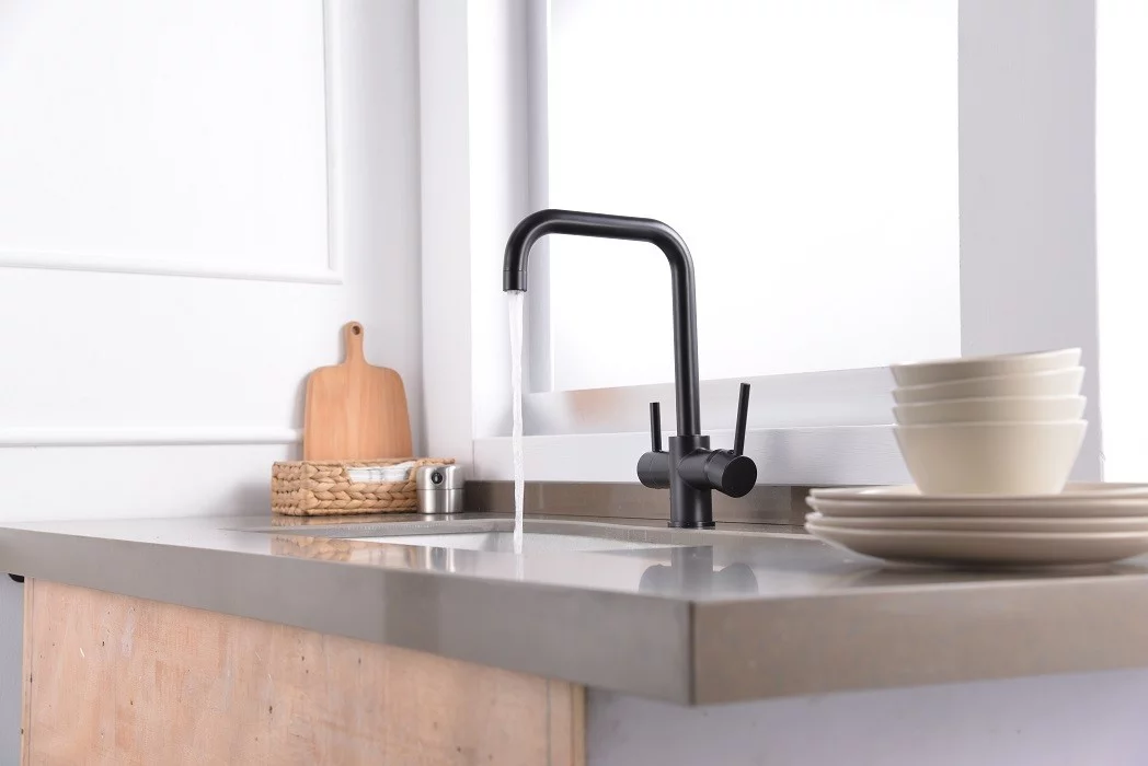 Dotată cu o pipa si doua duze, bateria permite accesul separat la apa filtrată și nefiltrată, eliminând necesitatea unei baterii suplimentare sau a modificărilor la blat.