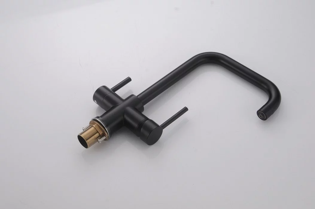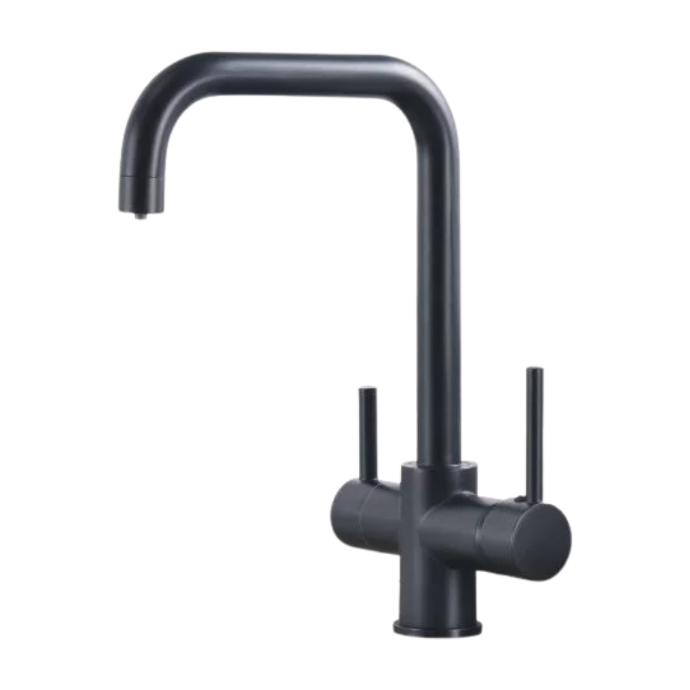 Baterie Bucătărie cu 3 Căi, pentru Apă Filtrată, Neagră, Finisaj Mat, Pipă Pivotantă, Înălțime 360 mm