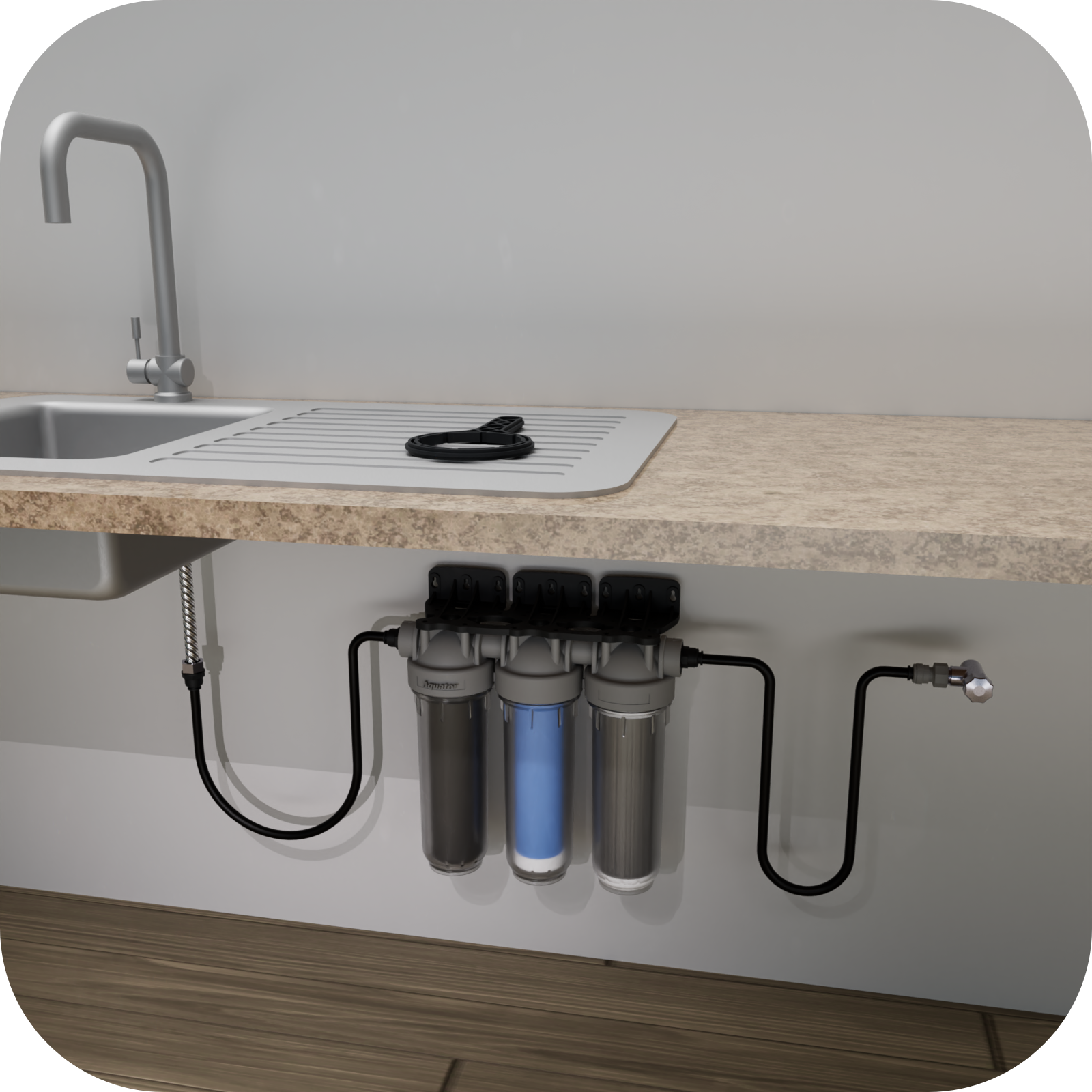 Filtrul Premium Maxi Triplex se montează sub chiuveta. Se conectează prin racorduri flexibile între conducta de apă rece și bateria chiuvetei. El este format din trei carcase, una conține o sită lavabilă din inox care filtrează mecanic la 50 microni, urmatoarea un cartus polipropilena antibacterian care filtreaza la 5 microni și o carcasă care conține rezerva din cărbune activ si argint, aceasta din urma filtreaza mecanic la 0,5 microni. Sita din inox si cartusul din polipropilena antibacteriana prelungesc durata de viață și capacitatea de filtrare mecanică a cartusului din cărbune.