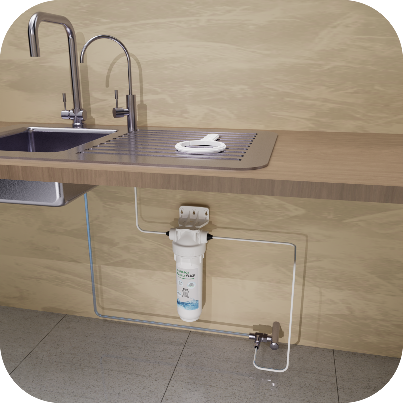 Carcasa filtrului Family Plus se montează sub chiuvetă. Se intercalează conectorul tip T pe traseul de apă rece de la chiuvetă. Bateria filtrului se montează pe blat astfel încât apa care trece prin filtru, apa filtrată, are robinetul separat de bateria de la chiuvetă, care are apă nefiltrată.